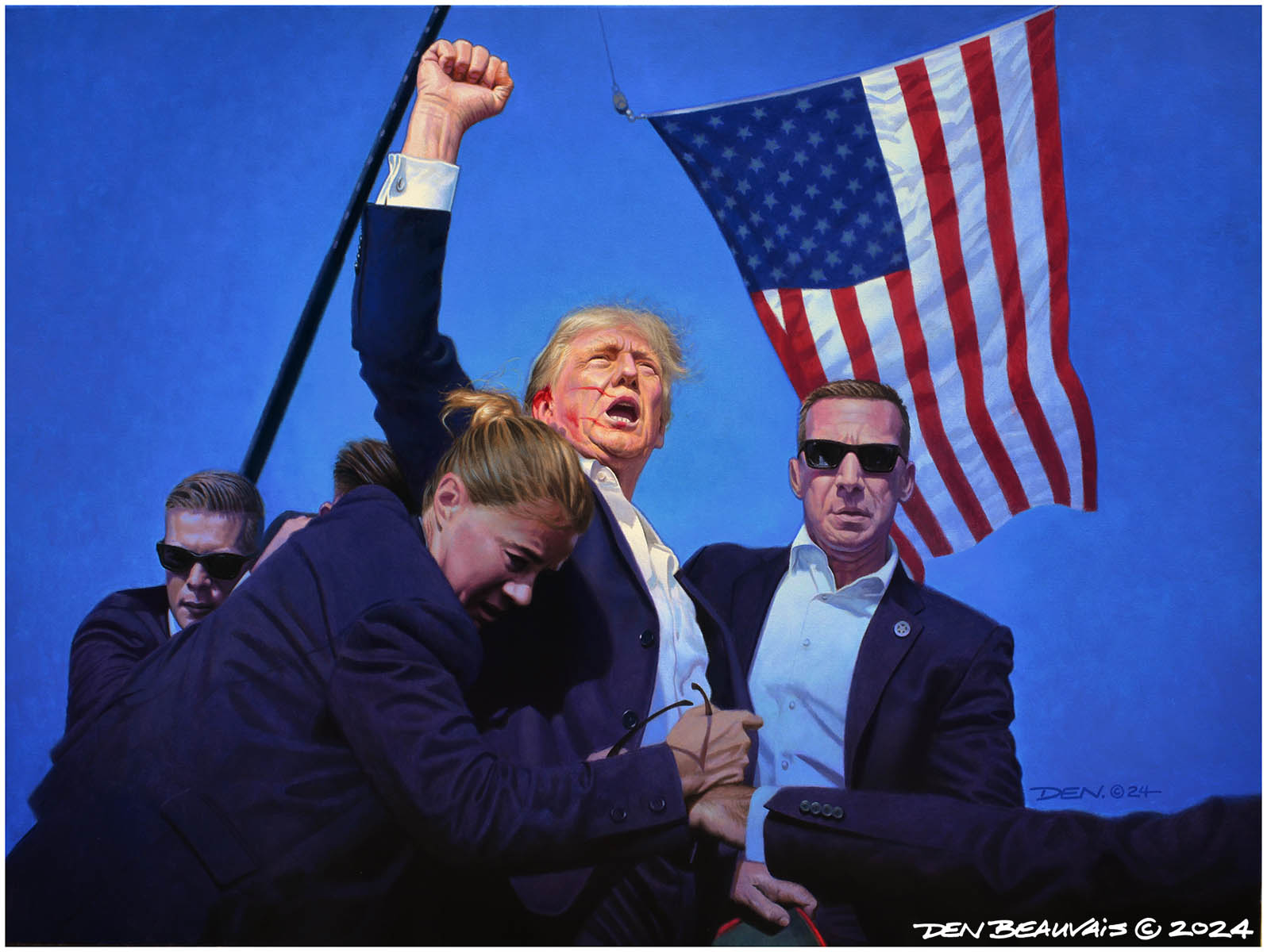 Trump Rises: The artist captures this iconic moment in time. Note that the Secret Service is muted in this painting, and President Trump is highlighted.